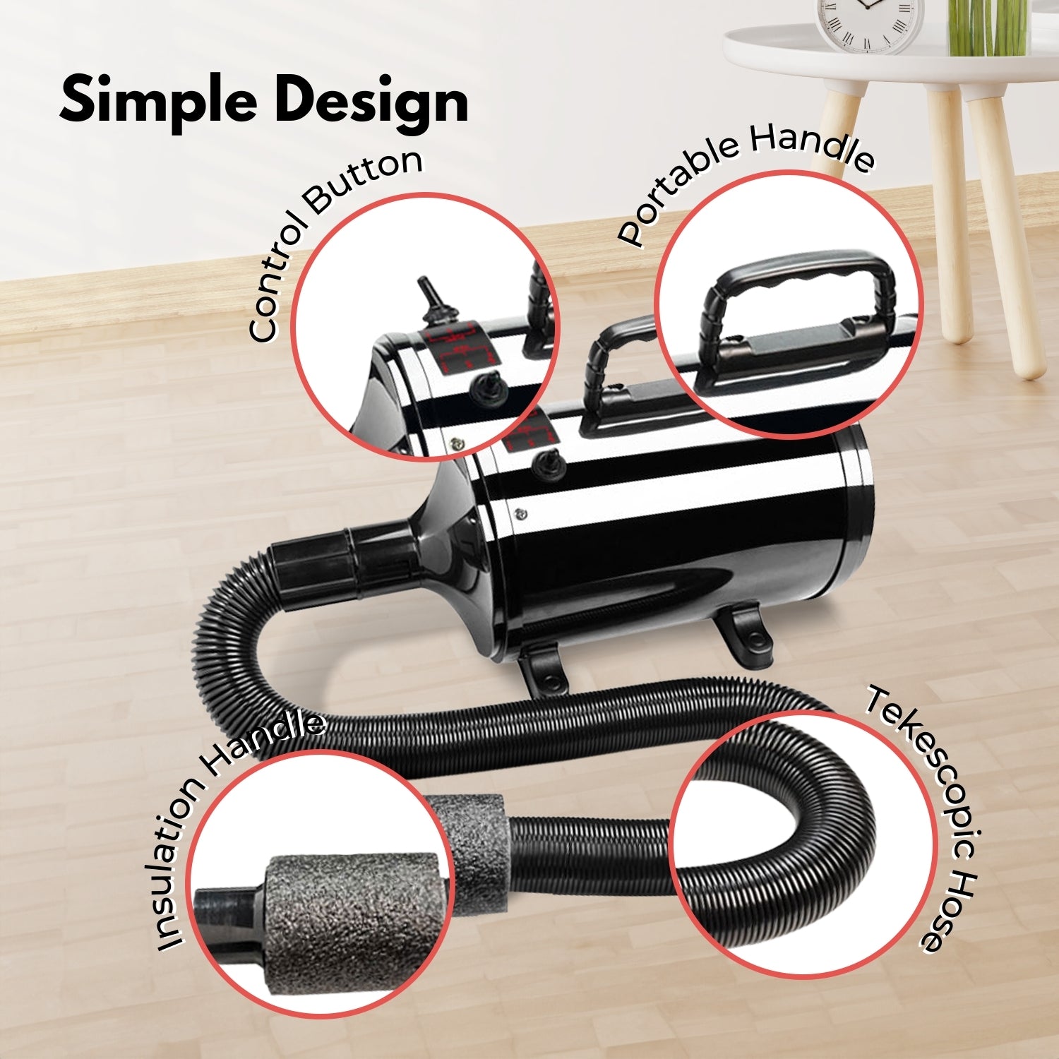- Versatile Air Outlet Options with Adjustable Hose: The pet hair dryer features four adjustable air outlets and a flexible hose for versatile drying options. This adaptability allows you to direct the airflow precisely for efficient and thorough drying.