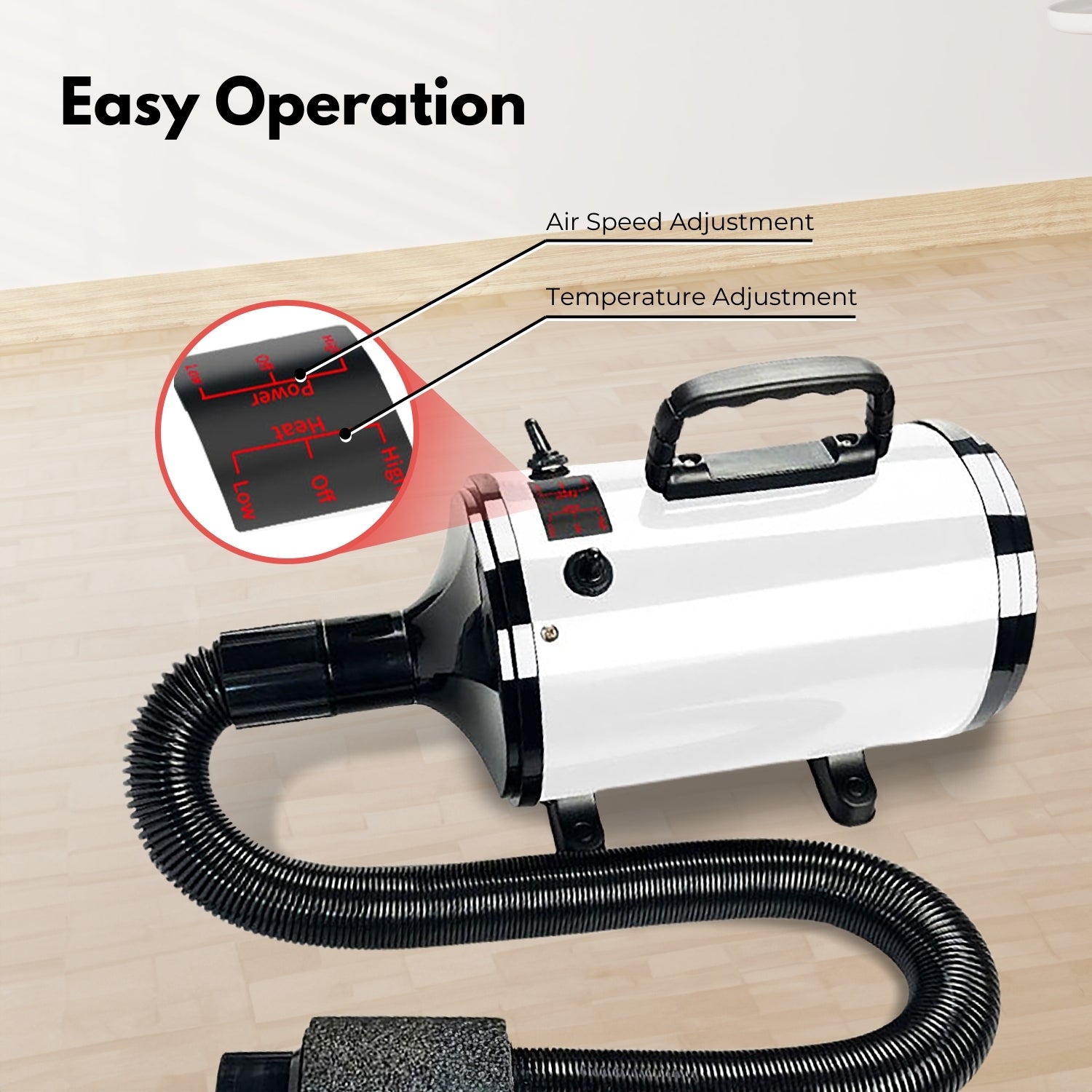 - Versatile Air Outlet Options with Adjustable Hose: The pet hair dryer features four adjustable air outlets and a flexible hose for versatile drying options. This adaptability allows you to direct the airflow precisely for efficient and thorough drying.