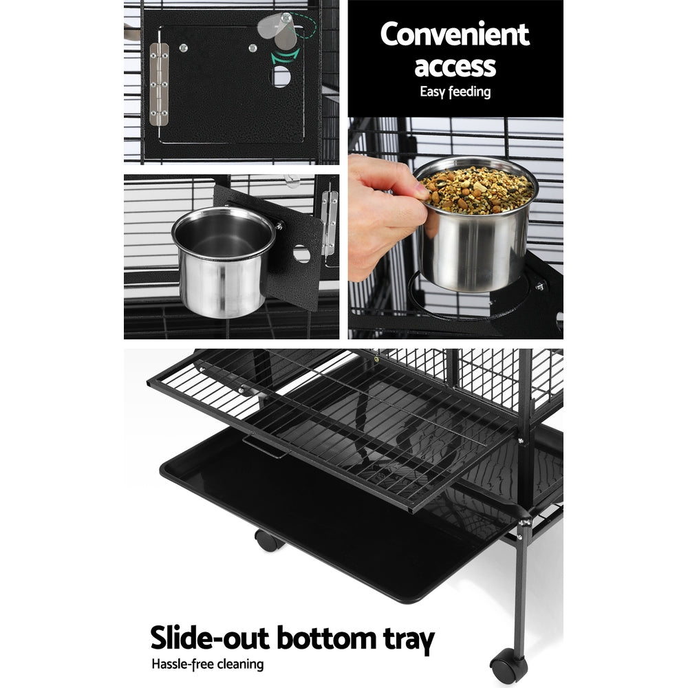 Caring for your birds is easy with the large access door, two small side doors, and five food and water bowls that can be easily reached for refills or cleaning. The slide-out top and bottom trays simplify cleaning, while the secure locks keep your birds safe from prying predators. The cage is mobile with sturdy legs and lockable wheel castors, and the round and smooth edges ensure safety for both you and your birds.
