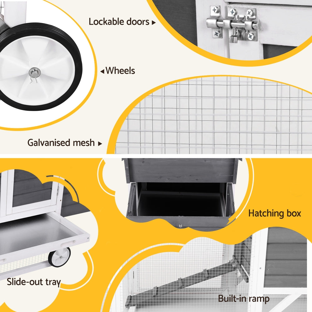 The i.Pet Chicken Coop offers a perfect blend of comfort, convenience, and mobility for your beloved pets. With a spacious enclosed play area, a dedicated hatching box for easy egg collection, and a portable design featuring two wheels, this coop ensures your animals have a safe and enjoyable environment. Crafted from durable fir wood with a weather-resistant finish, it is built to withstand the elements and provide long-lasting use. The secure galvanised mesh and latches keep your pets safe from predators, while the slide-out tray makes cleaning a breeze.