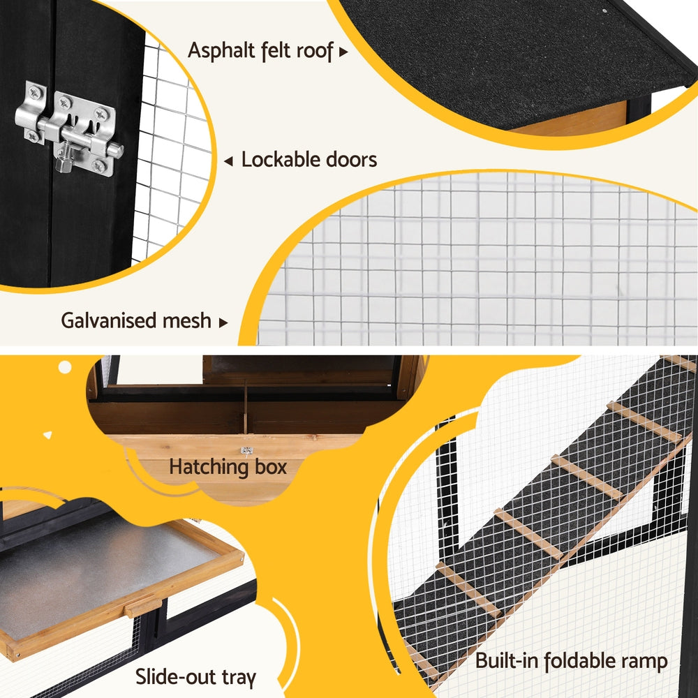 The i.Pet Chicken Coop is the ideal solution for providing your pets with a safe, comfortable, and well-ventilated environment. This coop features a hatching box for effortless egg retrieval, offering convenience and practicality for backyard chicken keepers. Constructed from durable fir wood with a weather-resistant asphalt roof, it ensures your pets are protected from the elements. The spacious enclosed play area with an integrated foldable ramp allows your animals to roam freely, while the secure galvanised mesh and latches keep them safe. The slide-out tray makes cleaning simple and easy.